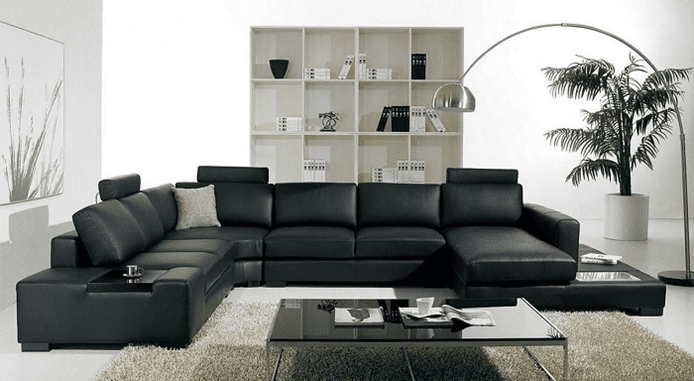 Кожаные диваны в основном имеют коробчатую форму и лучше всего подходят для больших гостиных, в которых могут разместиться не менее восьми человек. На рынке широко представлены высококачественные кожаные диваны различных цветов, хотя многие потребители предпочитают черный цвет и оттенки черного и белого. Стеклянный чайный столик и черный кожаный диван выделяются на фоне темных стен и коврового покрытия. У них также есть дополнительные декоративные подушки. Темный кожаный диван дополняется простым декором.